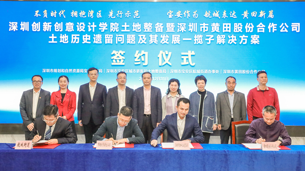 深圳新闻网宝安讯(见圳客户端、深圳新闻网记者 谢莹 实习生 张潇潇)12月31日下午,深圳创新创意设计学院土地整备暨深圳市黄田股份合作公司土地历史遗留问题及其发展一揽子解决方案签约仪式在航城街道举行。区委书记姚任,区长郭子平,区委常委、常务副区长蔡英权,区委常委、区委区府办主任孟锦锦,区委常委朱恩平,区政协副主席何家鸿出席签约仪式。