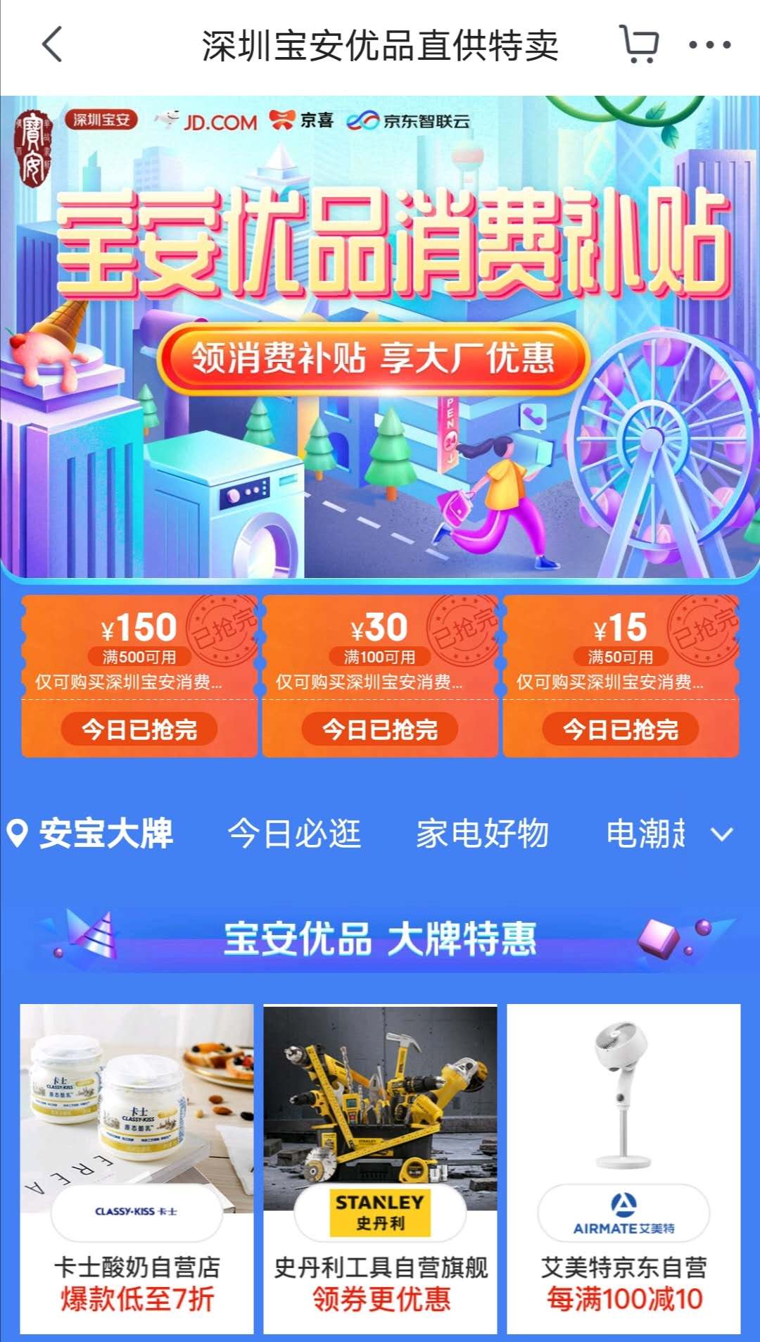 同日,京东商城“宝安优品专区”满减活动同步启动。集合宝安区小家电、食品、家居等行业企业,通过京东主站和京东旗下社交电商平台京喜提供总价值5000万的消费券,消费者通过在平台领券(满500减150、满100减30、满50减15三类),可直享补贴优惠。
