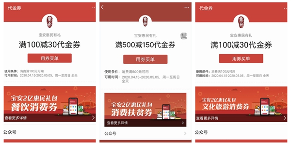 首批26.4万张消费券已于4月15日通过腾讯支付平台向已报名市民投放,涵盖购物、餐饮、文化旅游、健康生活、消费扶贫等5个品类,消费券金额分别为满500减150,满100减30和满50减15。