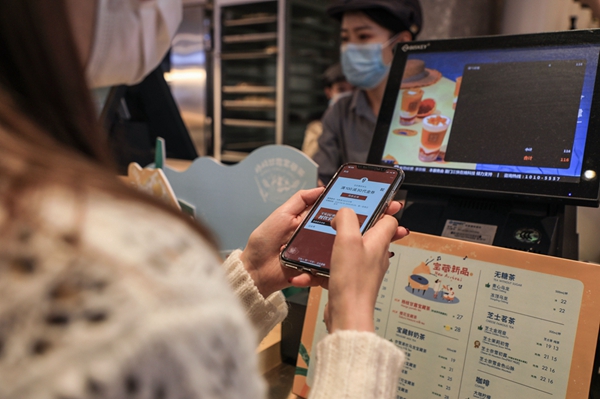 消费者体验的第一站是位于海雅缤纷城的网红店“柰雪的茶”。虽然是工作日的下午,但店内生意依然火爆,坐满了品尝茶饮的市民。“请问你们这里可以使用宝安区消费券吗?”“可以!”记者进店后首先向工作人员确认是否能使用餐饮消费券,得到肯定的回复后,开始按照正常开始点单。工作人员告诉记者,本次消费是该门店迎来的第一笔“宝安区消费券”消费。