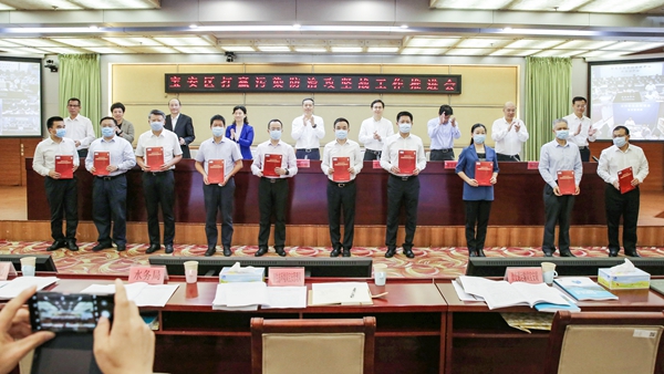 4月21日上午,宝安区打赢污染防治攻坚战工作推进会在区委区政府附楼一楼召开,对宝安打赢污染防治攻坚战进行再动员、再部署、再推进,确保高质量完成污染防治年度目标任务。区委书记姚任、市水务局局长张礼卫等与会领导向全区十个街道、区住建局、宝安交通运输局、市生态环境局宝安管理局、区水务局、区城市管理和综合执法局,以及中电建生态环境集团有限公司、中国交通建设股份有限公司、机场集团、深圳市大铲湾港口投资发展有限公司发放了《宝安区2020年污染防治攻坚责任书》。区长郭子平主持会议,区人大常委会主任张志彪,市水务局副局长钟伟民,市生态环境局副局长尹杰,区领导孟锦锦、朱恩平、朱桂明参加会议。
