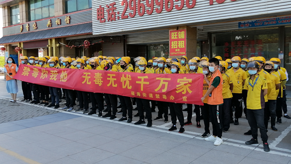 现在外卖行业发展迅速,群众更多的就餐方式大部分都是通过外卖解决,外卖行业有覆盖面广、与群众接触频繁、受众面大等优势。为提高本辖区禁毒宣传覆盖面和影响力,本次活动通过由70余名美团外卖小哥组成的外卖禁毒宣传队,化身禁毒宣传使者,向餐饮店和酒店店主派发禁毒宣传手册。在为用户派送美食的同时,为群众送上宣传单及宣传小礼品,通过宣传单为群众介绍毒品的种类及危害,让群众在就餐时了解禁毒知识,进一步提高了群众防识毒、防毒、拒毒能力。同时,引导居民们树立正确的人生观和价值观,呼吁居民们积极参与禁毒工作,发现涉毒线索时积极举报,全民共创安定无毒绿色环境。