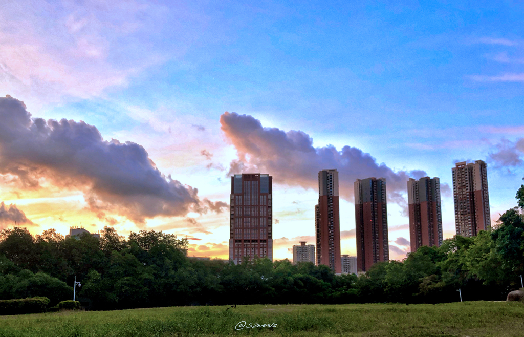 临近中午,宝安中心区热浪渐高但有风徐来,减轻了些许燥热,澄澈的蓝天与高楼相接,丝丝浮云如絮轻轻舞,团团白云从高耸的建筑上空掠过。