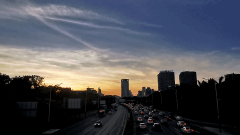同一时刻的107国道上,暮色四合路灯一盏盏亮起,建筑泛起点点光亮,路上车行如织,演绎出流光溢彩。西方的金色光芒不再耀眼,彩霞遍布半个天空,天空一点点沉淀下来,靛蓝的宝安夜空完成换装。