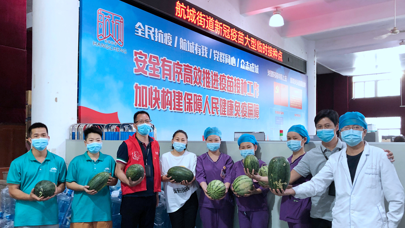 5月28日下午,位于航城街道黄麻布社区内的爱心企业——凤凰山农趣谷组成慰问团,为航城街道九围大型疫苗接种点的医护工作者和街道工作人员送去了近百个爱心西瓜。这既是送去了温暖,也是送去激励。