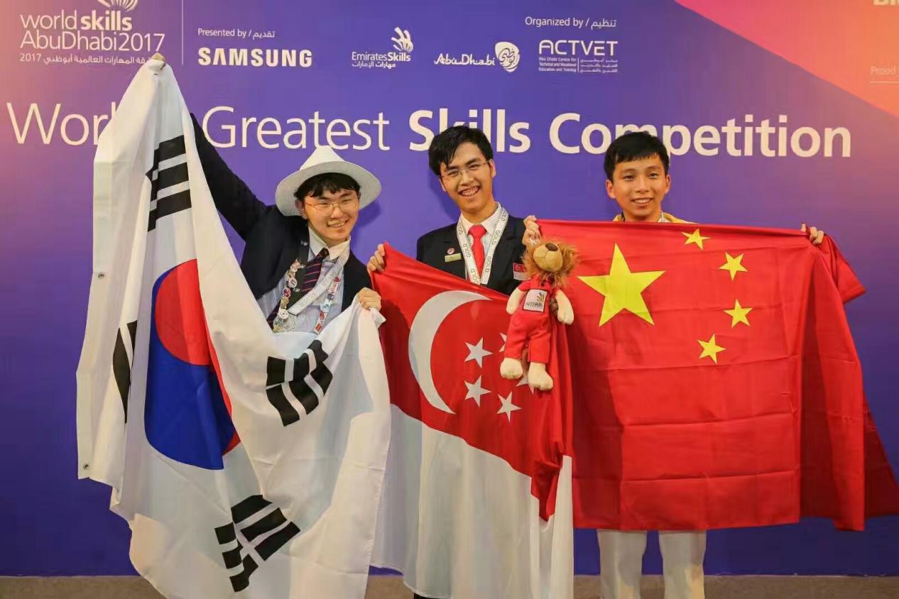 郑宗林在世界技能大赛中高举五星红旗(右一)