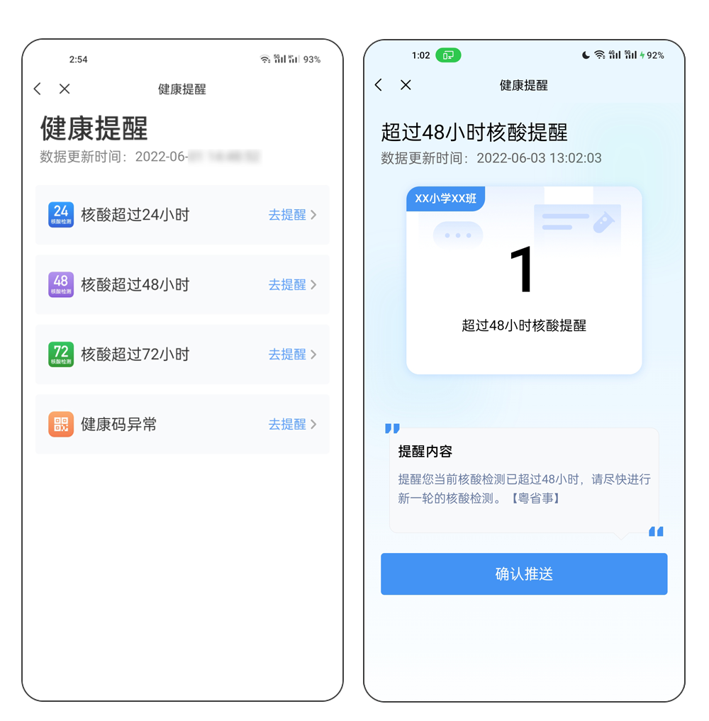 班主任在班级团体详情页点击“健康提醒”,进入健康提醒列表页,选择所需内容的提醒条件,点击“去提醒”,可查看团体内符合该条件的人数,并推送提醒短信。目前支持对成员的核酸有效时间(24、48、72小时)和粤康码颜色两方面进行消息提醒。