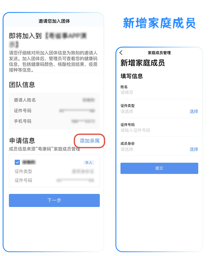 如学校要求学生共同居住人加入班级团体,家长可转发二维码或链接给对应亲属,或直接在“加入班级团体页面”页面点击“添加亲属”,填写亲属信息并通过人脸识别验证后,添加家庭成员。若之前已在粤康码家庭成员管理中添加过该成员,其信息则会自动同步至申请成员列表中。