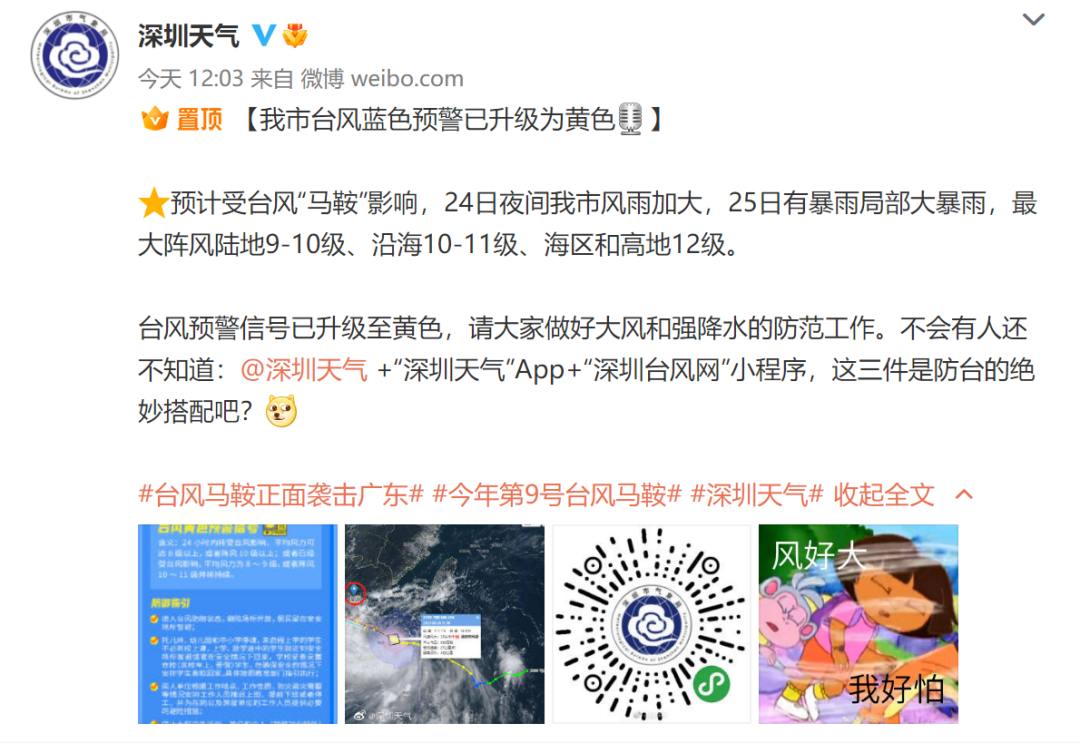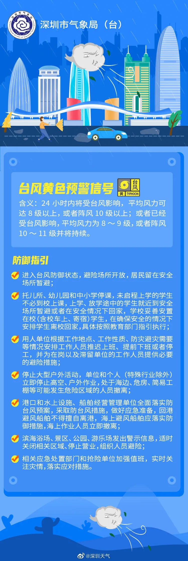 深圳市气象台2022年08月24日12时将全市台风蓝色预警信号升级为黄色,预计受台风“马鞍”影响,24日夜间我市风雨加大,25日有暴雨局部大暴雨,最大阵风陆地9-10级、沿海10-11级、海区和高地12级,信号可能持续1天。全市进入台风防御状态。