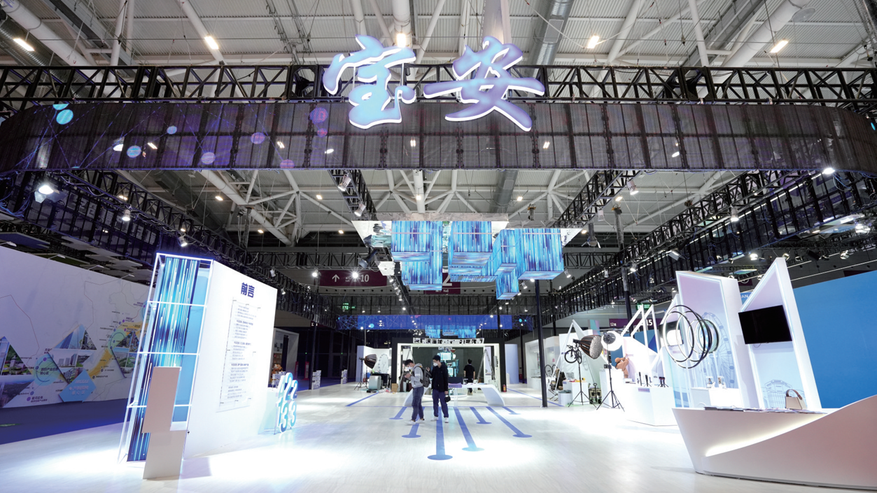 记者了解到,今年宝安展馆以元宇宙概念体现宝安数字创意产业及文体旅商产业在未来的发展活力。选用元宇宙多元色,以蓝色为主色调融合元宇宙其他6大流行色系,以元宇宙虚拟城市融合空间为设计理念,体现宝安产业支撑级与未来产业融合发展的规划脉络。策展思路采用“大产业、小样板”的呈现逻辑,创新宝安产业叙事体系,串联产业发展之间的生态关系。