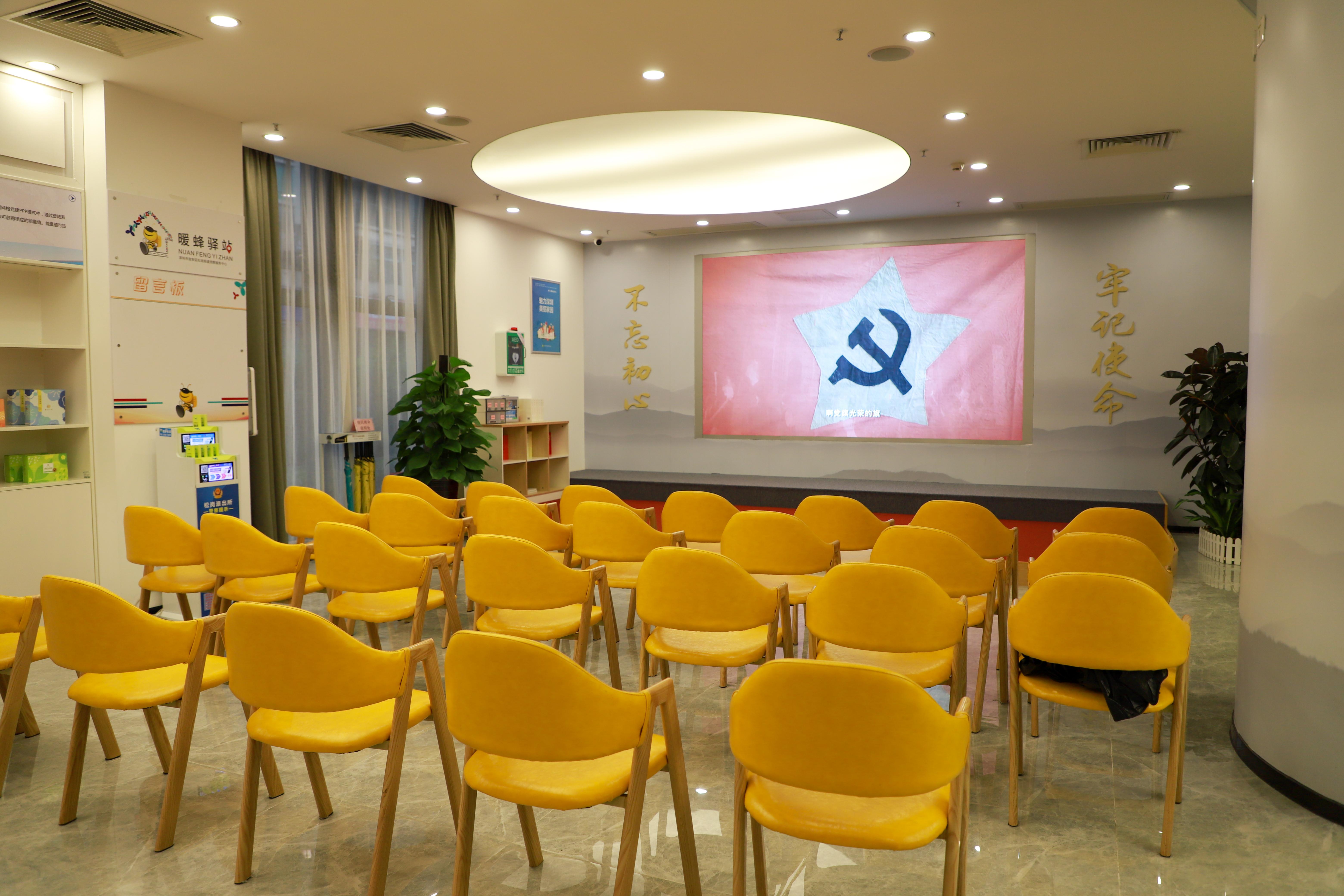 其中,学习教育厅学习贯彻习近平新时代中国特色社会主义思想主题教育,还有以“党的光辉历程”为主题的党史史料展览和中国共产党百年奋斗历程的大事记。此外,为增强学习趣味性,还设置了延安窑洞红色打卡点,凸显了“延安精神,薪火相传”主题。特别值得留意的是,过道中间设置了一面松岗非遗文化墙,松岗是全市极少数同时拥有国家、省、市、区四级非遗项目的街道,传承非遗文化,赓续中华血脉。党群服务厅主要为周边群众、过往市民提供相应的便捷服务,有网格党建志愿服务积分超市、暖蜂驿站和轮椅、雨伞、药品等应急物品设备,还有影视播放和小舞台,从本月起,每晚还会举行文化春雨主题音乐会。人才服务厅主要介绍党建共建人才交流融合的单位和活动开展情况,介绍深圳人才战略、松岗的发展环境和街道人才保障措施方面的内容。挂牌“人才服务站”及“深圳职业技术大学数字创意与动画学院技术技能人才培养培训基地”,为人才交流提供场所,不定期举办项目路演、创业沙龙、讲座等活动。基层治理厅主要介绍党建引领社会治理工作成果案例。包括源头党建、政企共建、政校共建、地缘党建、毗邻党建、网格党建等多个党建工作成果。共享活动厅用于开展各类党群服务活动,如讲座、培训、医疗服务等活动,还包括舞蹈排练、钢琴室、器乐室、母婴休息、心理咨询等功能空间,都是对市民免费开放使用的。重温誓词厅主要是为机关单位、社区、企业两新组织党员开展活动提供的宣誓场所。