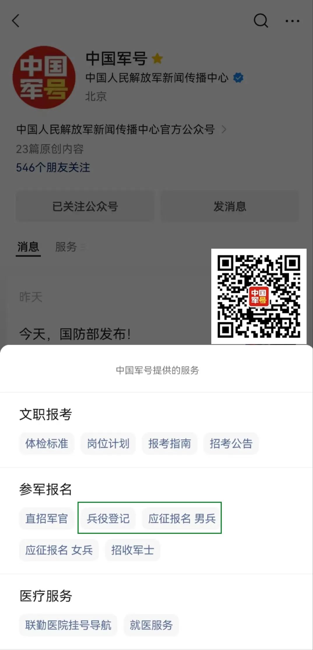 关注“中国军号”微信公众号识别二维码,进入全国征兵网报名 ↓