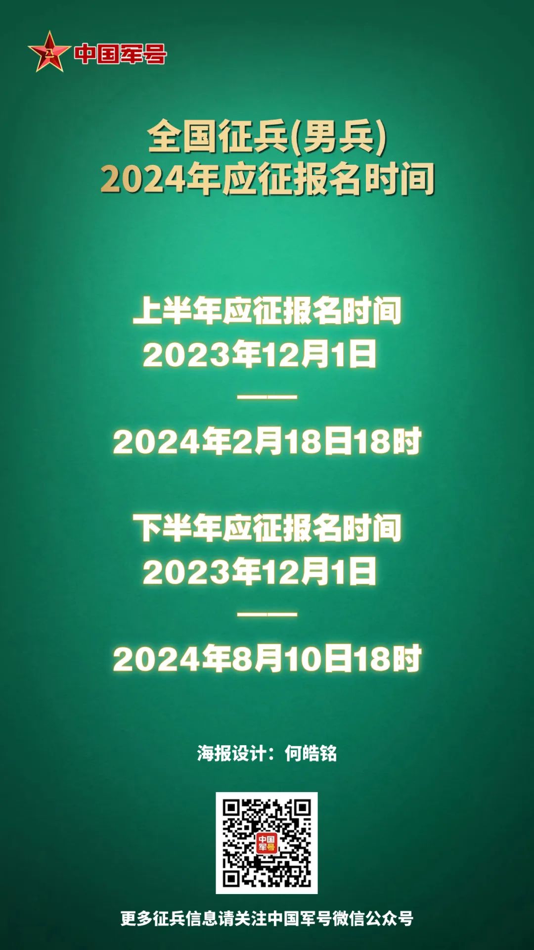 中国军号12月1日电 (何皓铭)记者从相关部门获悉,2024年上半年应征报名于今天(12月1日)开始。