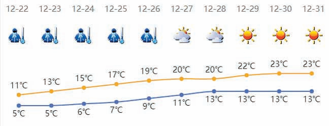 据气象部门分析,受强冷空气影响,连日来深圳以阴天为主,昨日全市气温普遍在8℃-10℃,较前一天同时段下降3℃-5℃,沿海高地记录到最大阵风7级-8级。自昨日夜间起气温继续下降,预计今天深圳中北部降至4℃左右,南部5℃-6℃,沿海高地最大阵风略有加大至8级左右,体感寒冷。受不断补充的冷空气影响,12月21日-24日深圳天气寒冷干燥,最低气温降至5℃左右;12月25日-26日晴天干燥,气温回升,早晚寒冷。