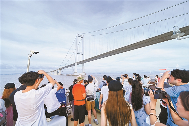 “海上看深中通道”新航线首发,市民近距离记录深中大桥。