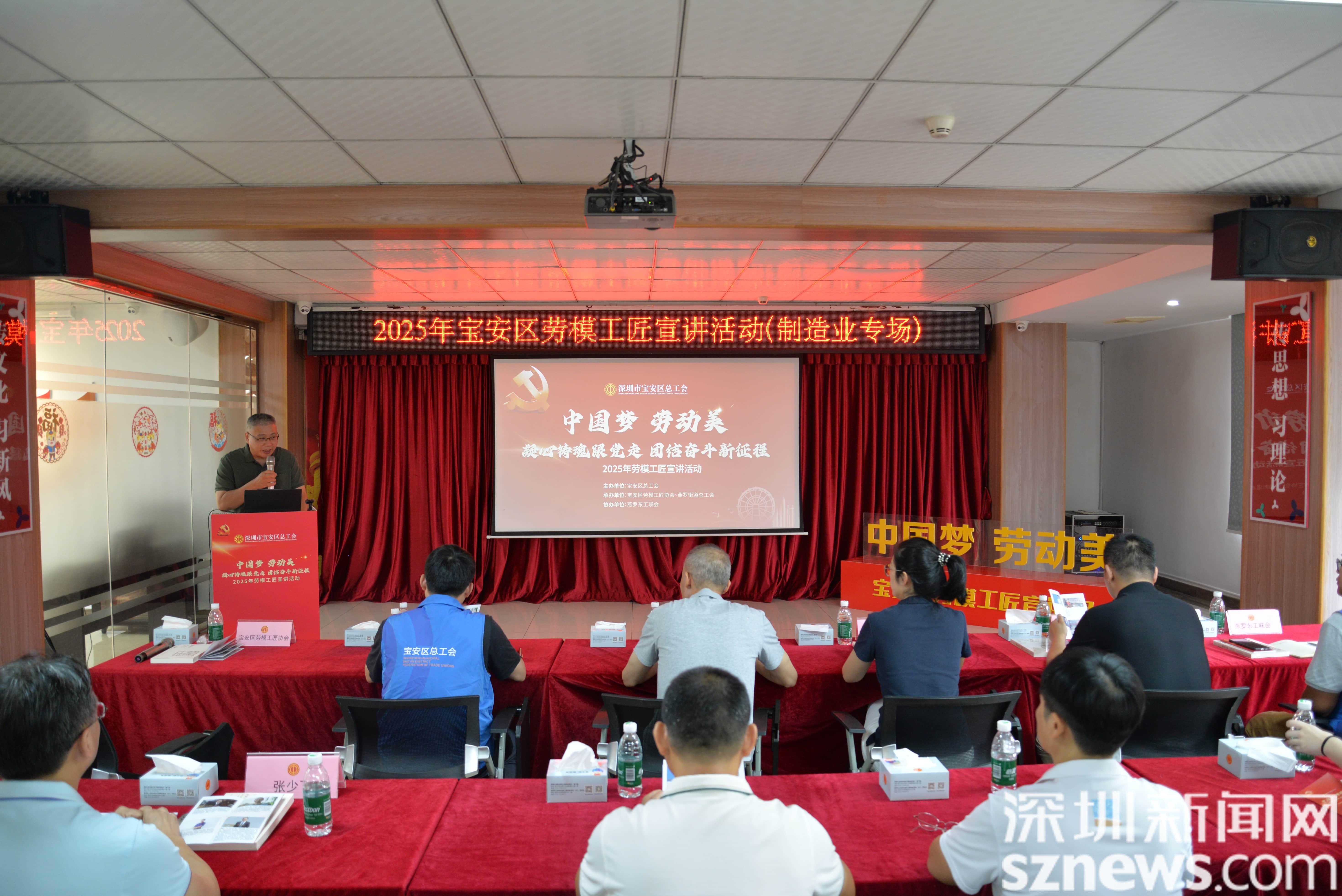 深圳新闻网2025年8月29日讯(记者 李小辉 实习生 杨子康)8月28日下午,2025 年宝安区劳模工匠宣讲(制造业专场)活动在燕罗街道燕罗东工联会举行。活动旨在弘扬劳模精神、劳动精神和工匠精神,邀请了广东省劳动模范、全国首届百名卓越模具工匠、第二届宝安大工匠、森骏卓越精密智造(深圳)有限公司技术总监张少飞,深圳市五一劳动奖章获得者、第三届宝安工匠、深圳市裕同包装科技股份有限公司环保研究院院长程雁飞作分享。宝安区总工会三级调研员沈爱军、劳动权益保障部部长张晨昱、燕罗街道总工会专职副主席杨启文以及来自宝安区各界代表共同参与,近距离聆听和感受劳模工匠的奋斗故事和磅礴力量。