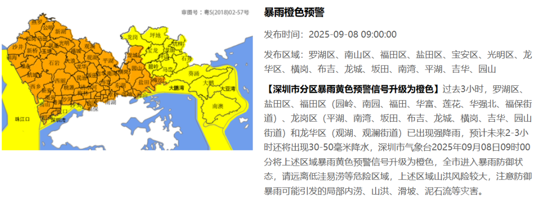 【深圳市分区暴雨黄色预警信号升级为橙色】过去3小时,罗湖区、盐田区、福田区(园岭、南园、福田、华富、莲花、华强北、福保街道)、龙岗区(平湖、南湾、坂田、布吉、龙城、横岗、吉华、园山街道)和龙华区(观湖、观澜街道)已出现强降雨,预计未来2-3小时还将出现30-50毫米降水,深圳市气象台2025年09月08日09时00分将上述区域暴雨黄色预警信号升级为橙色,全市进入暴雨防御状态,请远离低洼易涝等危险区域,上述区域山洪风险较大,注意防御暴雨可能引发的局部内涝、山洪、滑坡、泥石流等灾害。