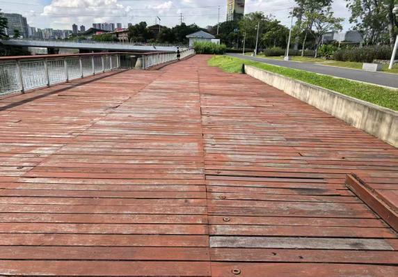 在蚝乡湖公园,原有老化腐烂的木地板被更换为耐腐蚀、防滑性能优良的塑木材料,新板材经防滑处理,即使在潮湿天气下也可确保游人安全。翻新后的亲水平台与自然环境和谐相融,成为市民休闲和摄影打卡的热门去处。