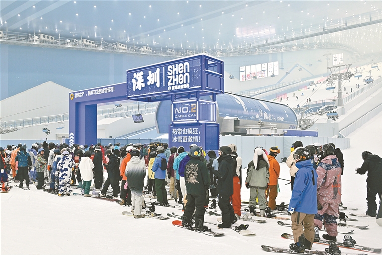 大批滑雪爱好者在前海冰雪世界排队等缆车。