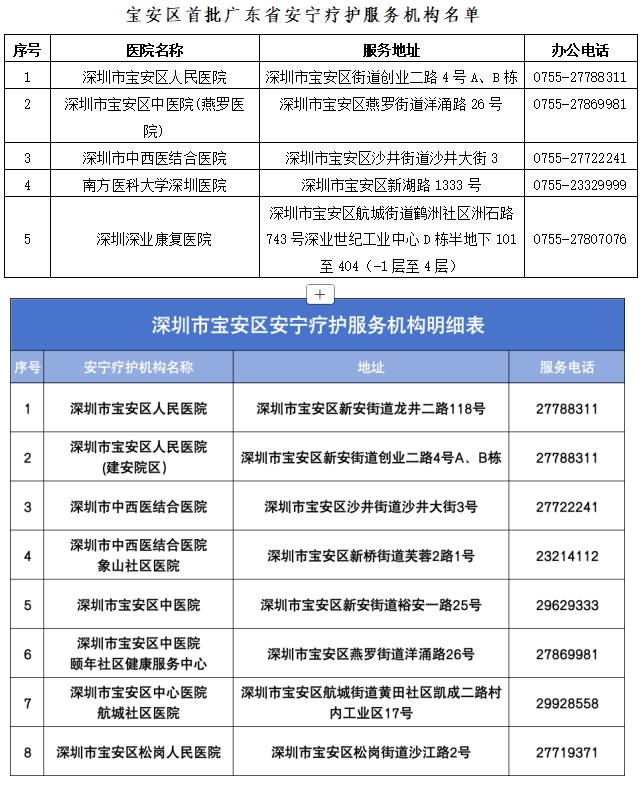 值得一提的是,近日广东省卫生健康委公布首批广东省安宁疗护服务机构名单,全省 214 家机构入选,其中深圳市 34 家,宝安区占 5 家,分别为宝安区人民医院、宝安区中医院(燕罗医院)、深圳市中西医结合医院、南方医科大学深圳医院、深圳深业康复医院。