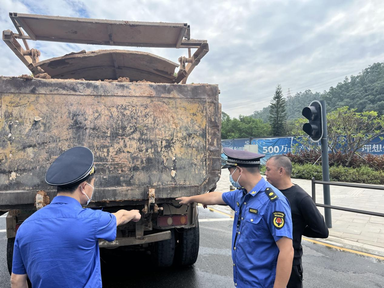行动聚焦东庄村路、凤塘大道、南环路、上南东路、中心路及施工工地出入口等泥头车高频通行路段,新桥街道采取“重点时段巡查+路段定点值守”相结合模式,加强早晚高峰期间巡查力度。执法过程中,执法队员坚持“严标准、零容忍”,严厉查处车身标识不清、密闭不严、渣土洒漏等违规行为,确保执法全覆盖、无死角;同时贯彻“教育与处罚相结合”原则,对违规车辆驾驶员现场开展法规宣传。此外,执法队员强化源头管控,动态巡查在建工地出入口,重点核查泥头车合规情况,督促施工单位落实主体责任,严格执行车辆密闭运输和冲洗保洁制度,从源头遏制超载、带泥上路等问题。