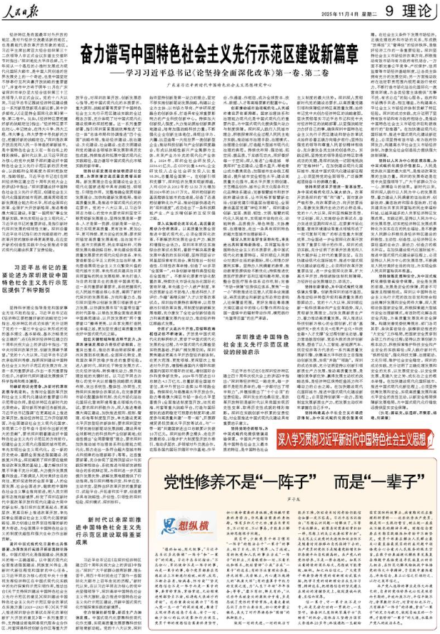 深圳新闻网讯 11月4日,人民日报理论版刊发文章《奋力谱写中国特色社会主义先行示范区建设新篇章——学习习近平总书记<论坚持全面深化改革>第一卷、第二卷》。文章称,新时代以来,以习近平同志为核心的党中央赋予深圳建设好中国特色社会主义先行示范区新的历史使命,从战略和全局高度为深圳把脉定向、指路领航,深圳在推进中国特色社会主义先行示范区建设中取得重要成果。以下是全文。