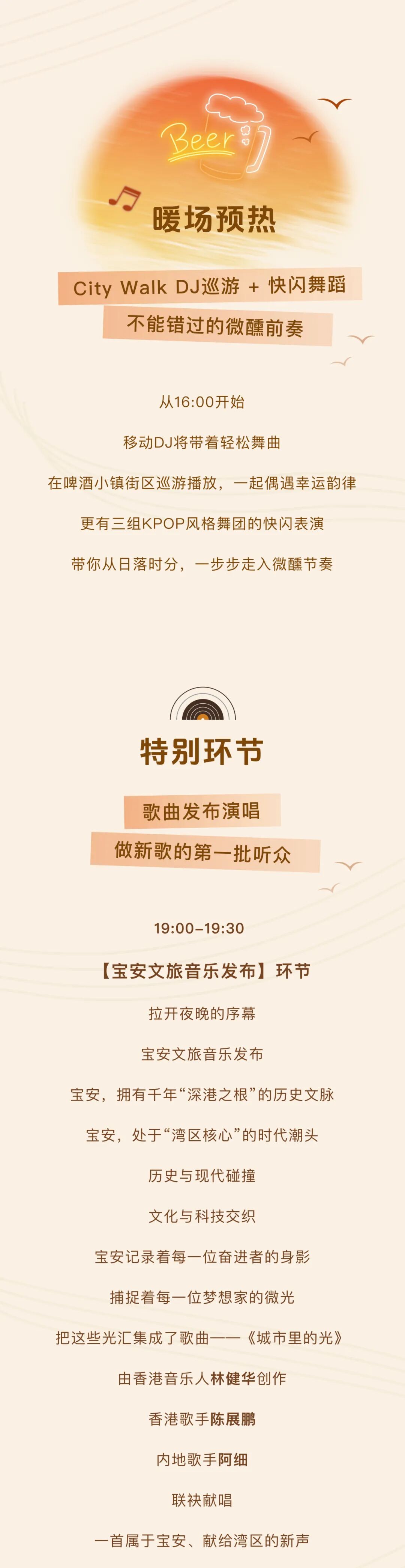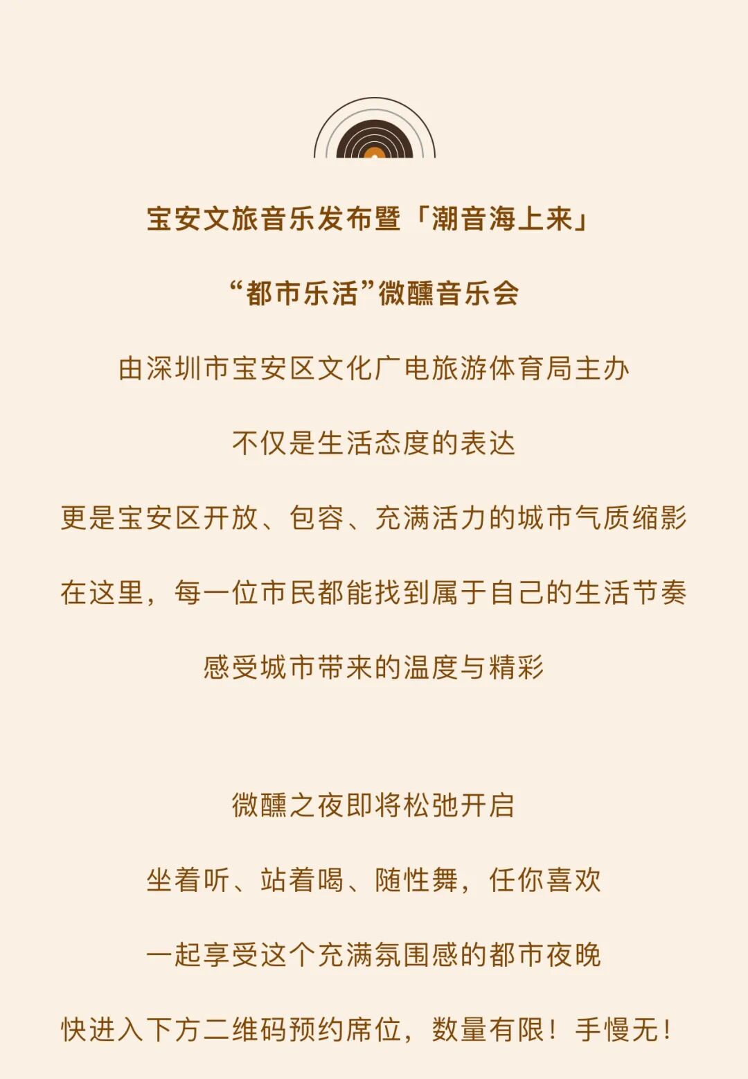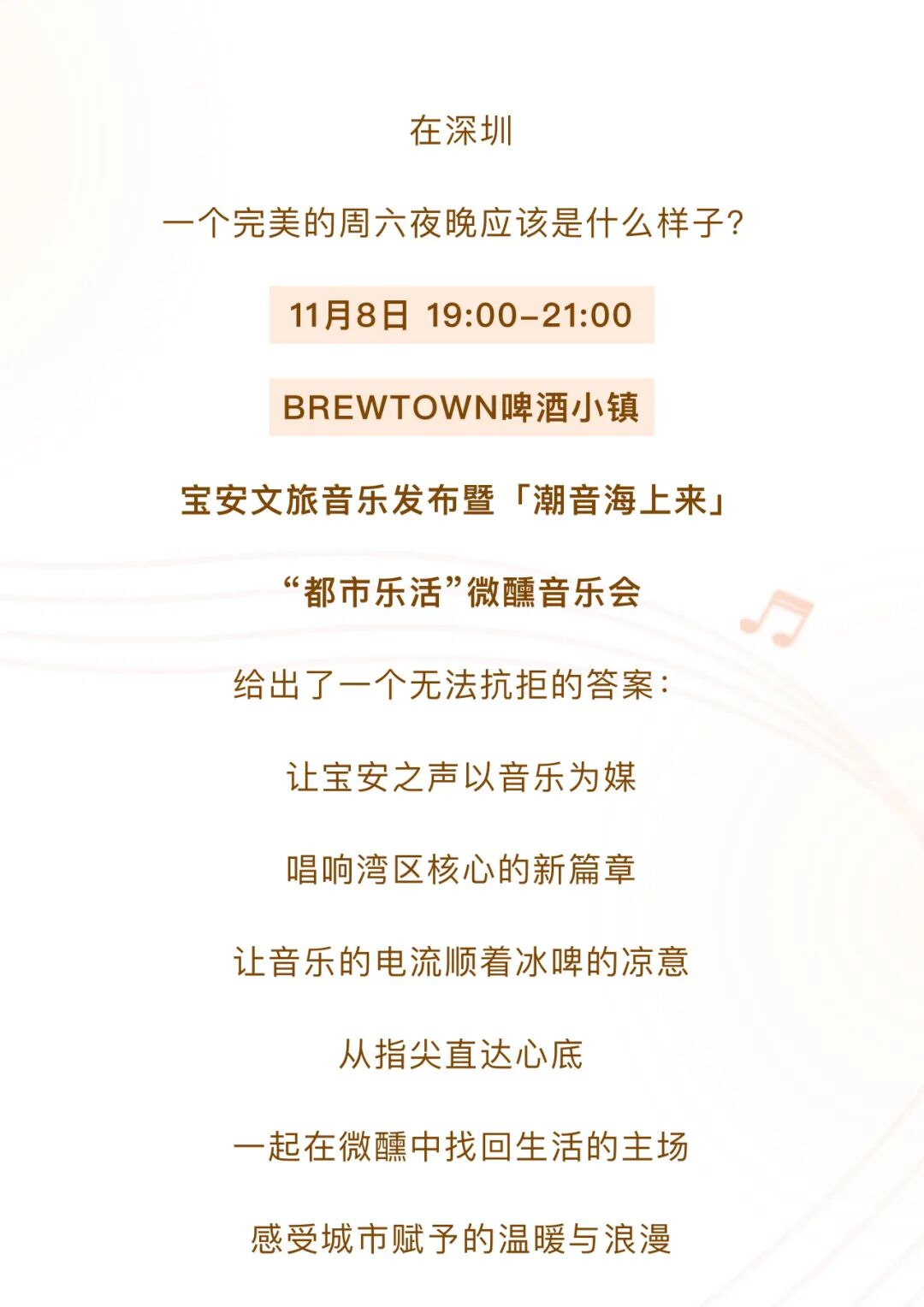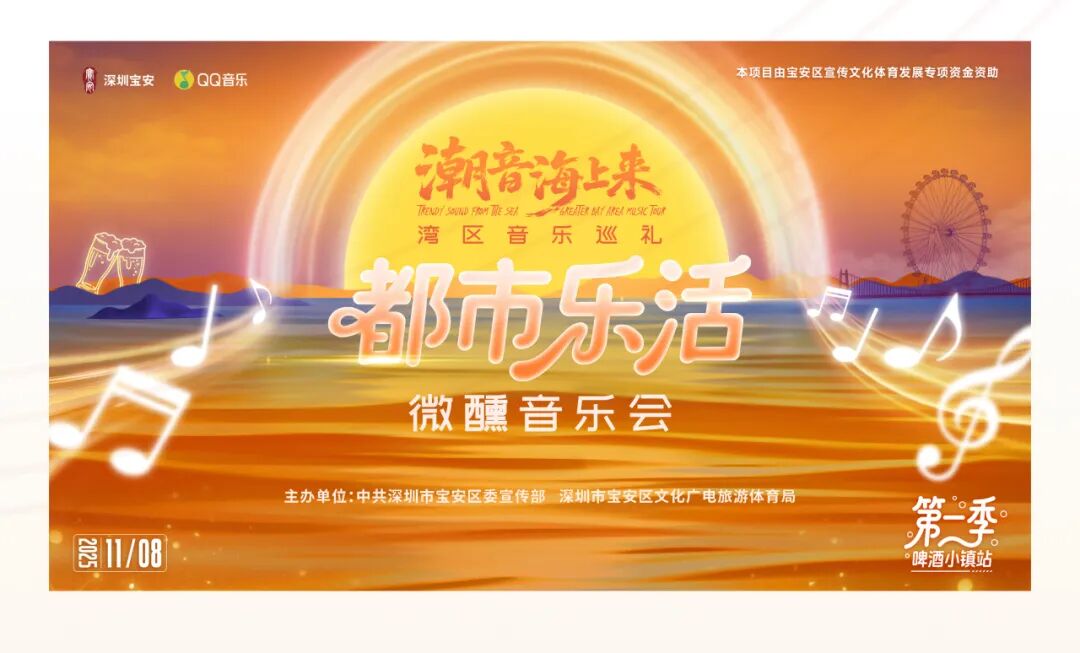 深圳新闻网2025年11月6日讯(记者 梁婷婷)11月8日19:00,深圳市宝安区文化广电旅游体育局主办的宝安文旅音乐发布暨「潮音海上来」“都市乐活”微醺音乐会将在BREWTOWN啤酒小镇正式启幕!这是属于宝安、献给湾区的歌,也是城市送给你的一封有声情书。