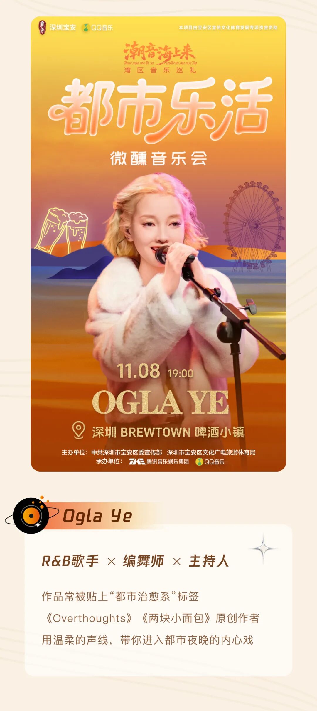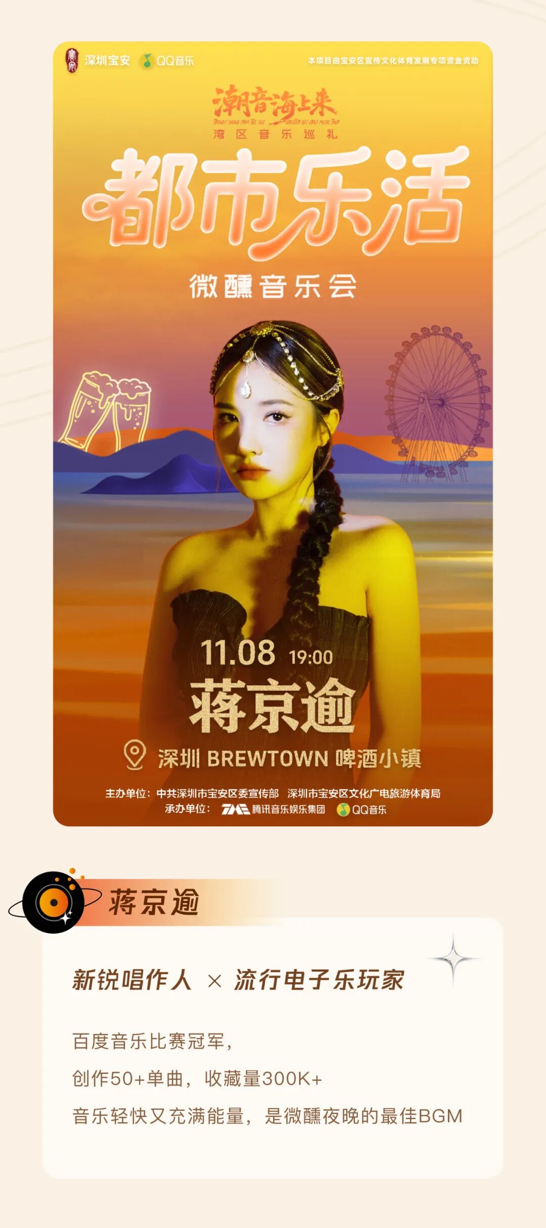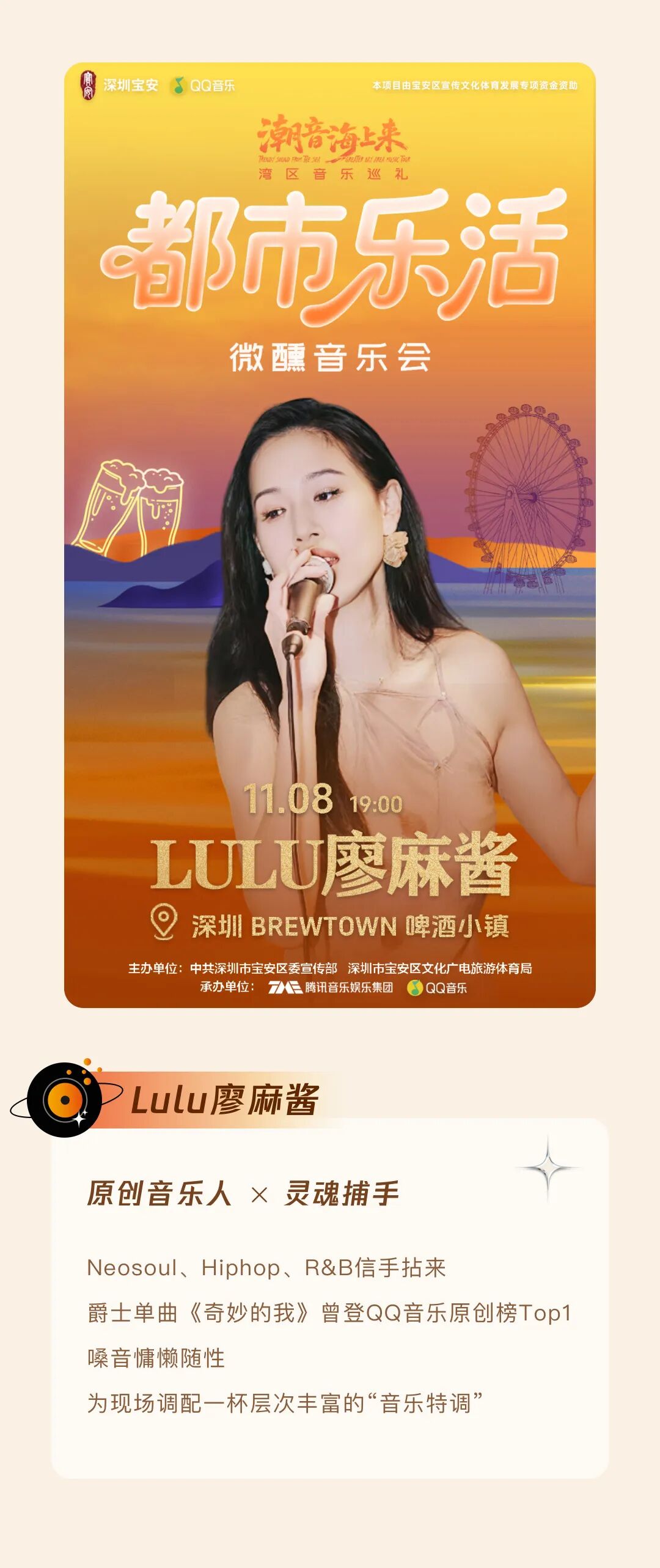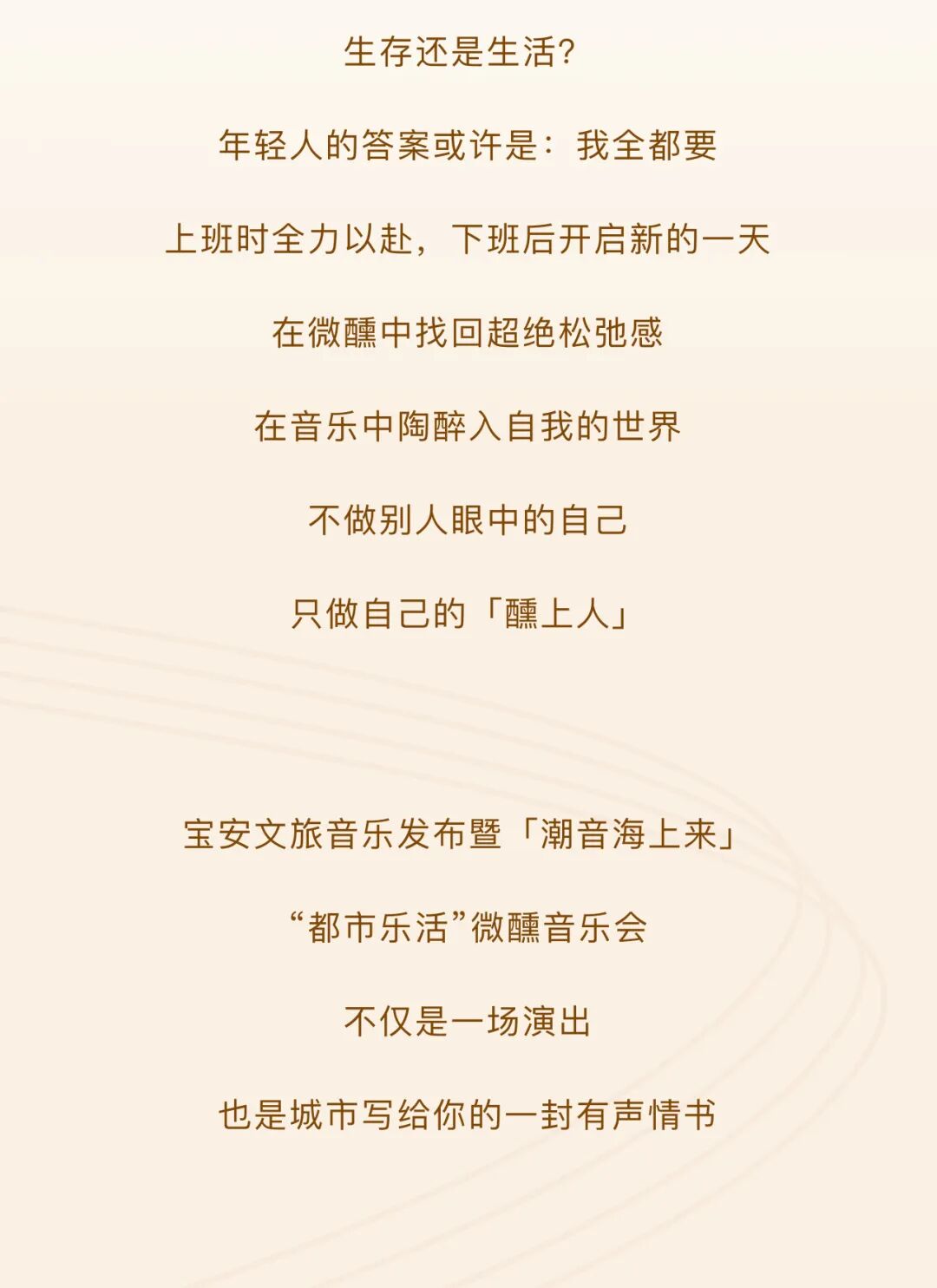 深圳新闻网2025年11月6日讯(记者 梁婷婷)11月8日19:00,深圳市宝安区文化广电旅游体育局主办的宝安文旅音乐发布暨「潮音海上来」“都市乐活”微醺音乐会将在BREWTOWN啤酒小镇正式启幕!这是属于宝安、献给湾区的歌,也是城市送给你的一封有声情书。