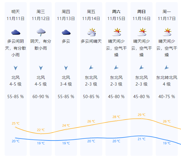 受台风“凤凰”和冷空气的共同影响,11-12日阴天间多云有分散小雨,东部沿海及高地最大阵风8-9级,气温逐日下降,天气转凉,其中11日气温20-25℃;