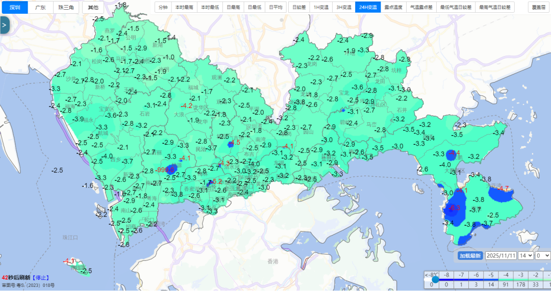 今天(11日)在台风“凤凰”和冷空气共同影响下,14时全市气温比起昨日同时段下降2-3℃。