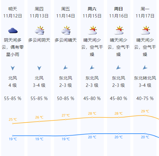12日阴天间多云,局地偶有零星小雨,气温19-25℃,偏北风最大阵风夜间8-9级,白天逐渐减弱。