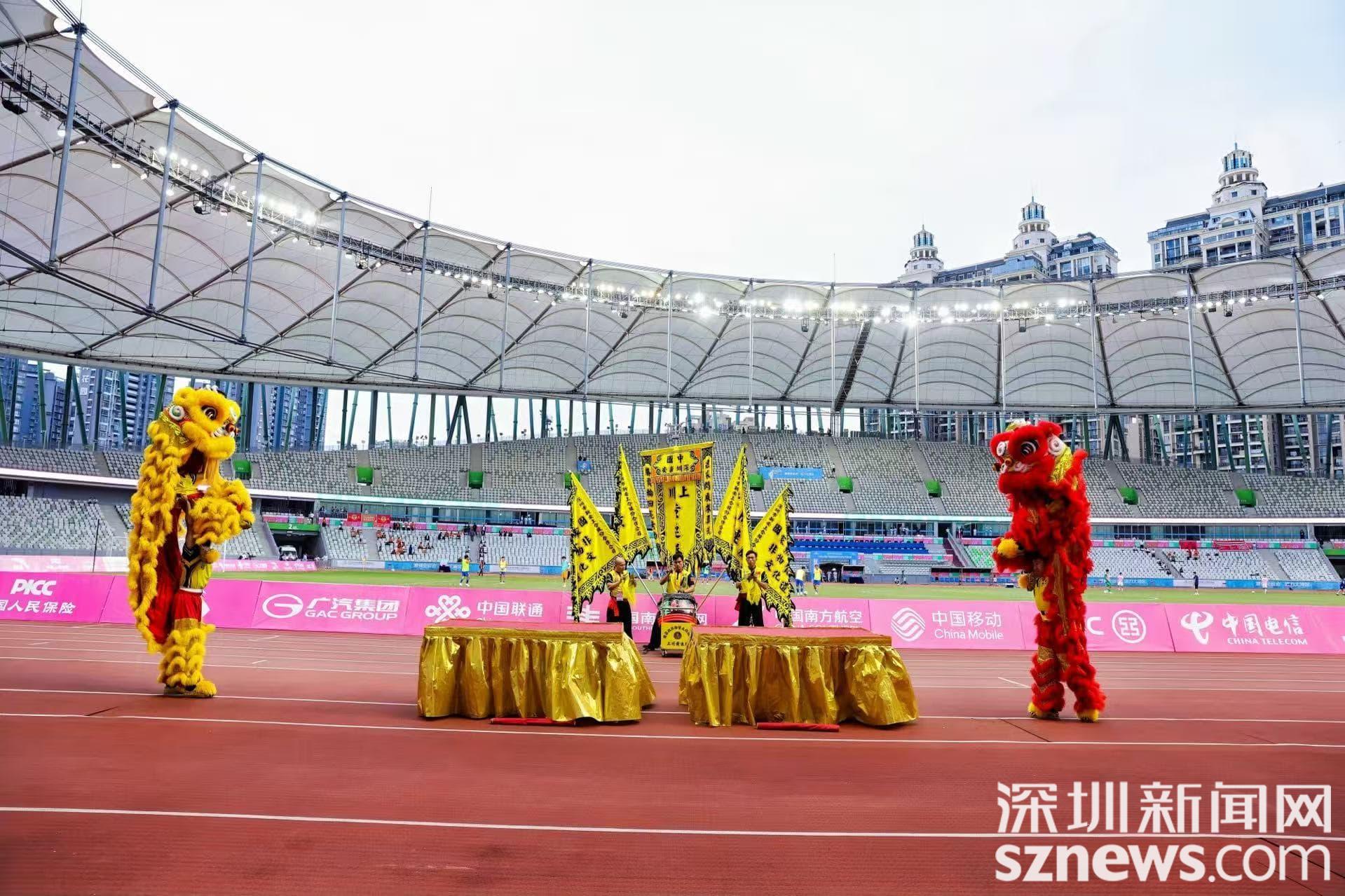 除闭幕式的高光亮相外,宝安非遗还深度融入十五运会多场关键活动,为盛会营造热烈氛围。国家级非遗项目“松岗七星狮舞”先后亮相群众比赛模型项目开赛仪式与拳击比赛决赛颁奖礼,以独特的艺术风格为赛事开篇与收官增添文化韵味;国家级非遗项目“上川黄连胜醒狮舞”则走进宝安体育场、龙岗大运中心体育场 、龙华体育场、深圳湾体育中心等多项赛事场地,在开场暖场与中场互动环节精彩献艺,用激昂的锣鼓和矫健的狮舞为体育健儿加油助威,点燃了赛场激情。