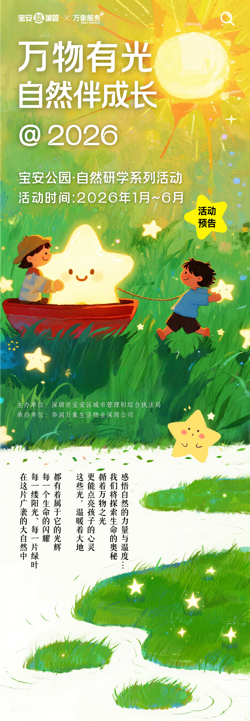深圳新闻网2026年1月7日讯(记者 李小辉)近日,由宝安区城市管理和综合执法局主办的宝安公园“万物有光·自然伴成长”自然研学季正式启幕。该活动将课堂搬到户外,在生机盎然的自然乐园里,通过游戏、探索、观察和记录,激发孩子对自然的好奇心和探索欲!