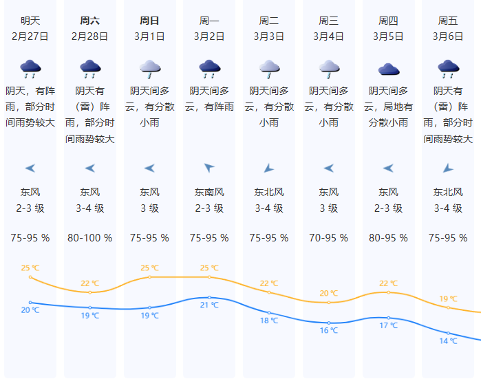 展望3月1-6日潮湿多雨,间中雨势较大,气温波动下降。