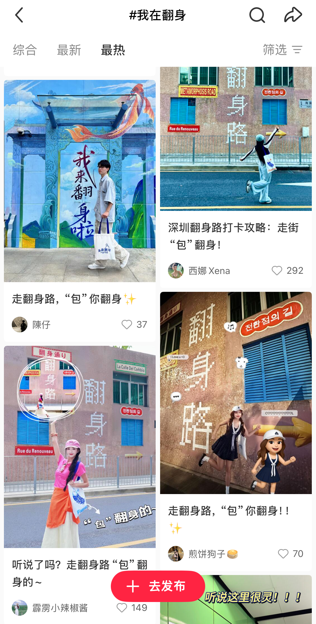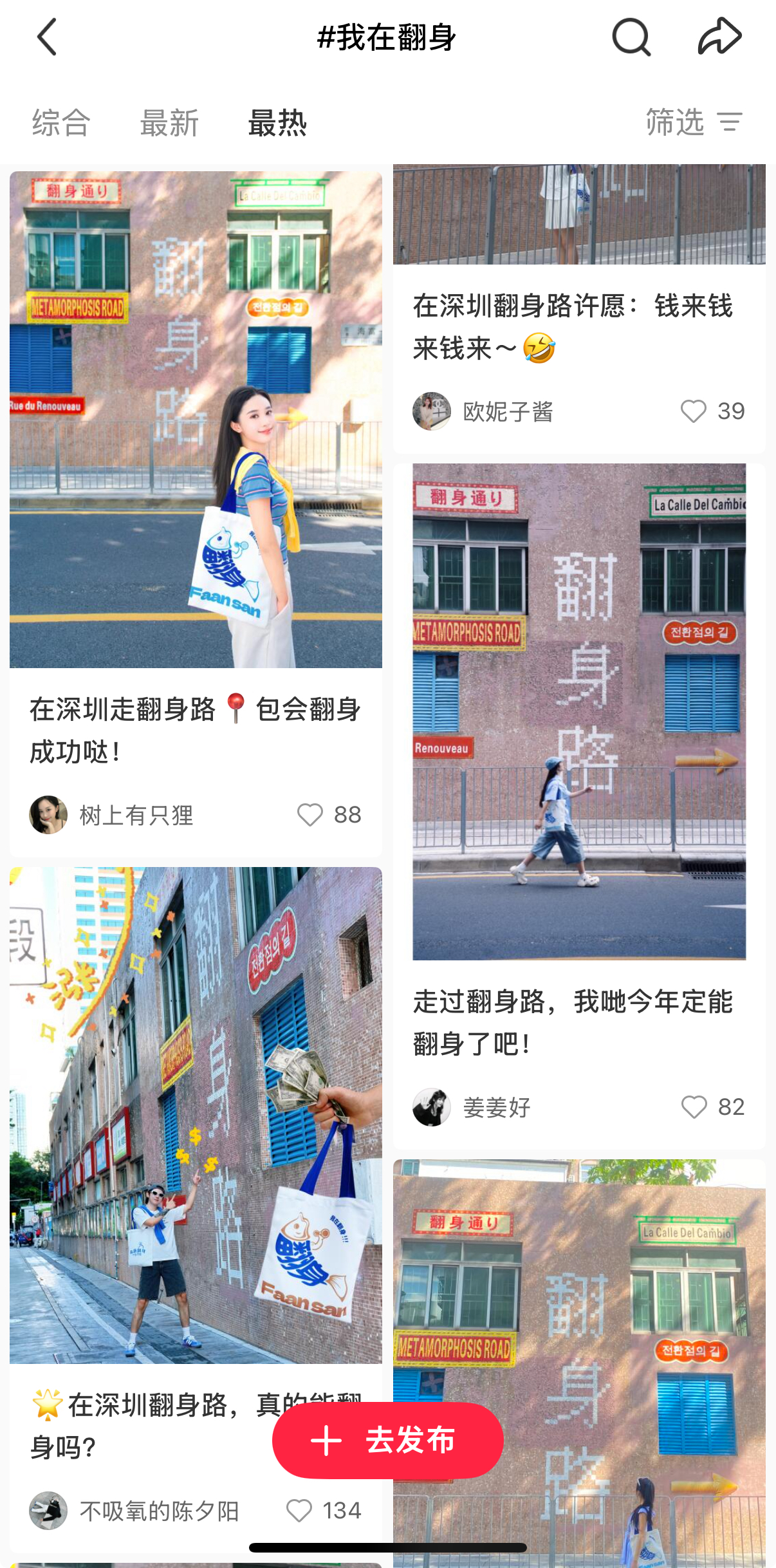 “我在翻身”项目启动以来,迅速在社交平台掀起打卡热潮。平台数据显示,“我在翻身”“翻身路”相关话题浏览量已近百万,吸引一批网络达人前来打卡分享,翻身路一跃成为深圳新晋网红地标。