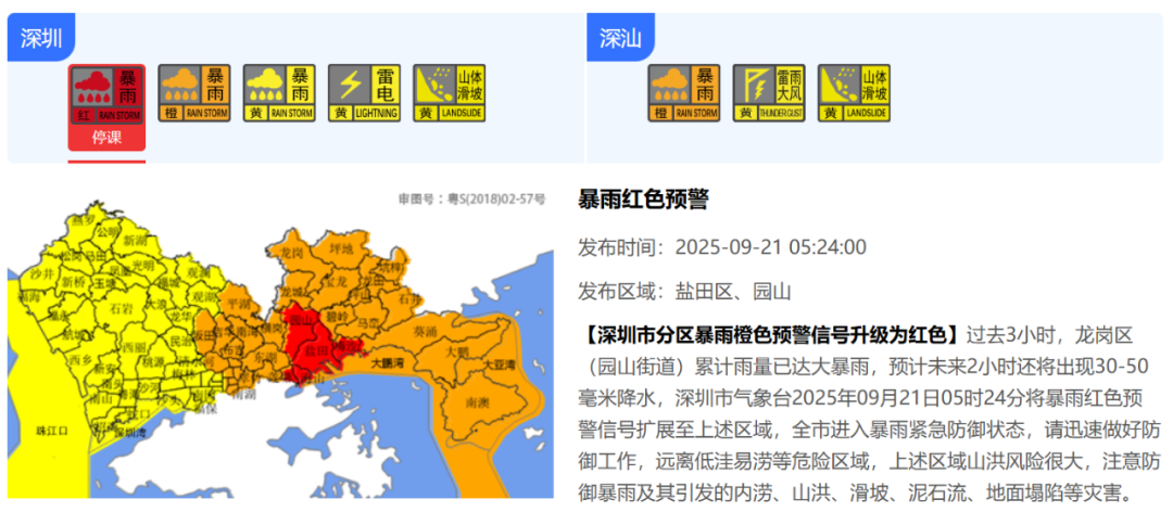【深圳市分区暴雨橙色预警信号升级为红色】过去3小时,龙岗区(园山街道)累计雨量已达大暴雨,预计未来2小时还将出现30-50毫米降水,深圳市气象台2025年09月21日05时24分将暴雨红色预警信号扩展至上述区域,全市进入暴雨紧急防御状态,请迅速做好防御工作,远离低洼易涝等危险区域,上述区域山洪风险很大,注意防御暴雨及其引发的内涝、山洪、滑坡、泥石流、地面塌陷等灾害。