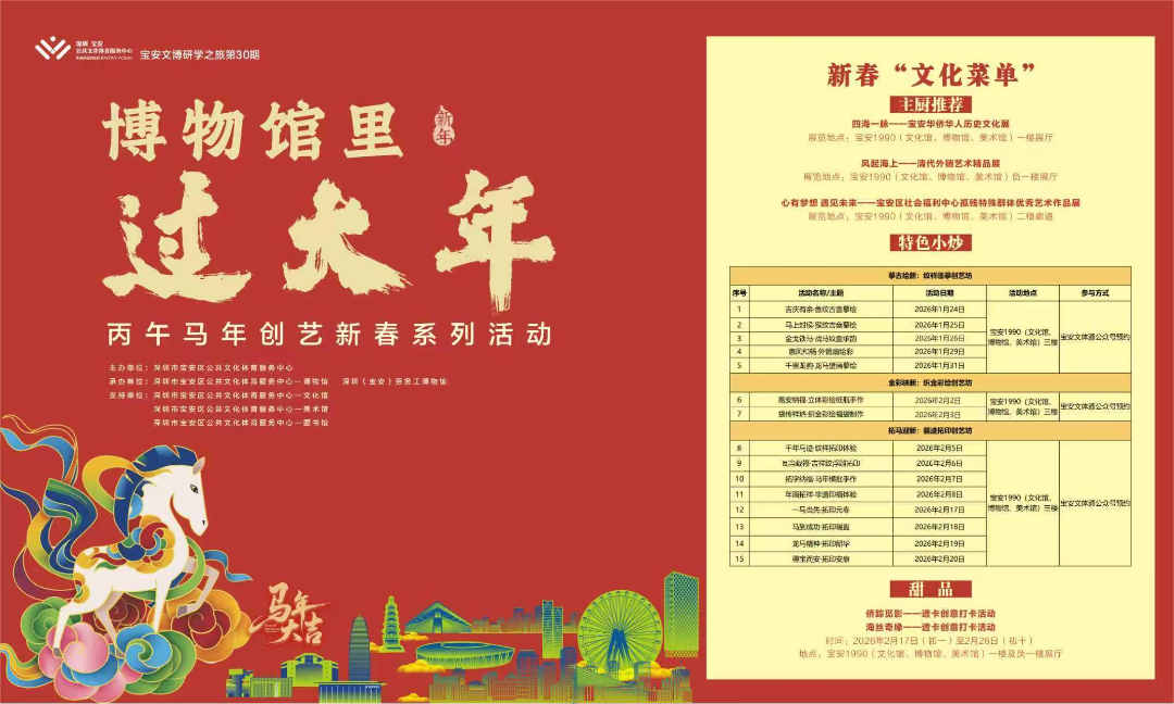 博物馆与城市空间联动,打造沉浸式文旅体验。宝安区公共文化体育服务中心—博物馆推出“博物馆里过大年”创艺系列活动,将马年文化意象与传统拓印技艺结合,市民可亲手制作年画与春联装饰,创意透卡打卡、文博问答集福等互动项目,提升观展参与感;社会福利中心特殊群体艺术作品展同步展出,传递温暖力量。此外,“新春文旅专线”巴士讲解、“湾区之光”摩天轮“云端迎新纪”讲解、展馆AR与裸眼3D新春讲解等活动,让城市空间成为流动的文化课堂。